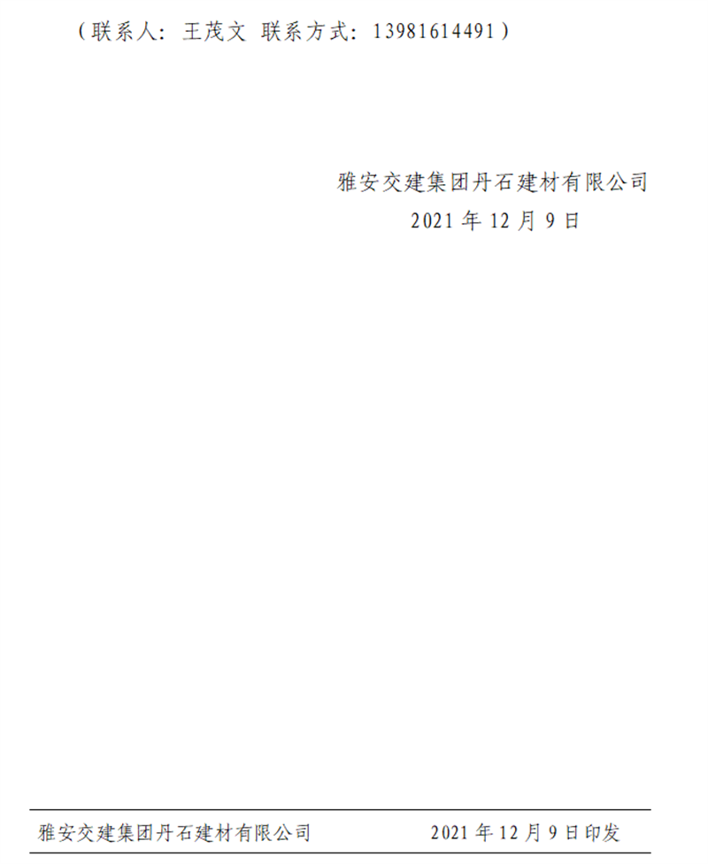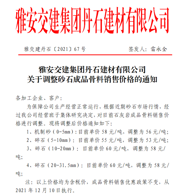 币游集团丹石公司关于调整砂石成品骨料销售价格的通知(2021.12.9)
