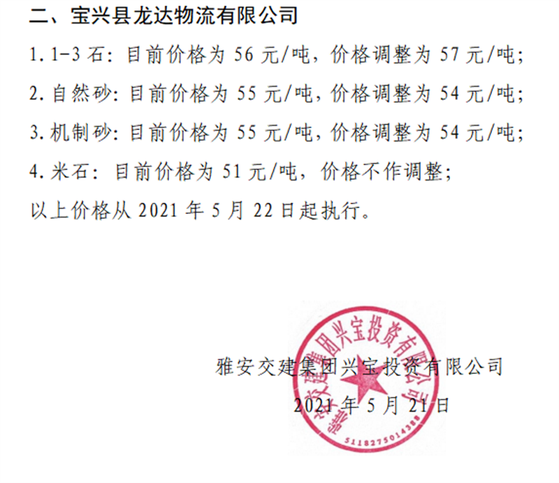 币游集团兴宝公司砂石骨料销售价格情况表(2021.5.22)