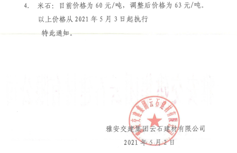 币游集团云石公司砂石骨料销售价格情况表(2021.5.3)