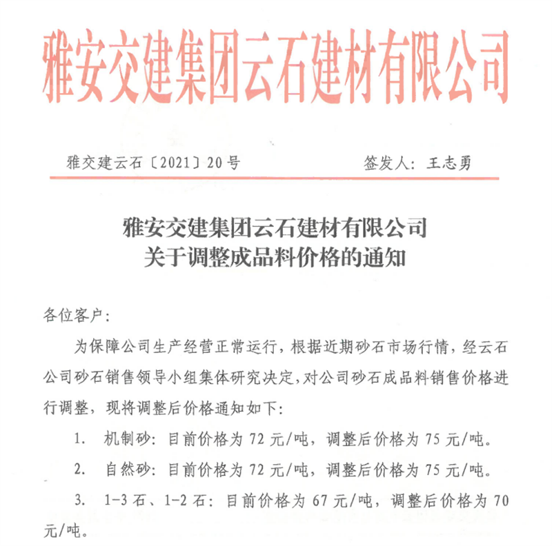 币游集团云石公司砂石骨料销售价格情况表(2021.6.20)