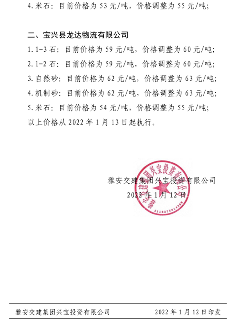 币游集团丹石公司关于调整砂石成品骨料销售价格的通知(2022.1.5)
