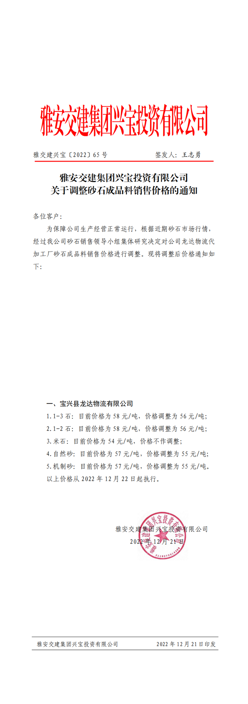 雅交建兴宝〔2022〕65号 关于调整砂石成品料销售价格的通知(2022-12-21)
