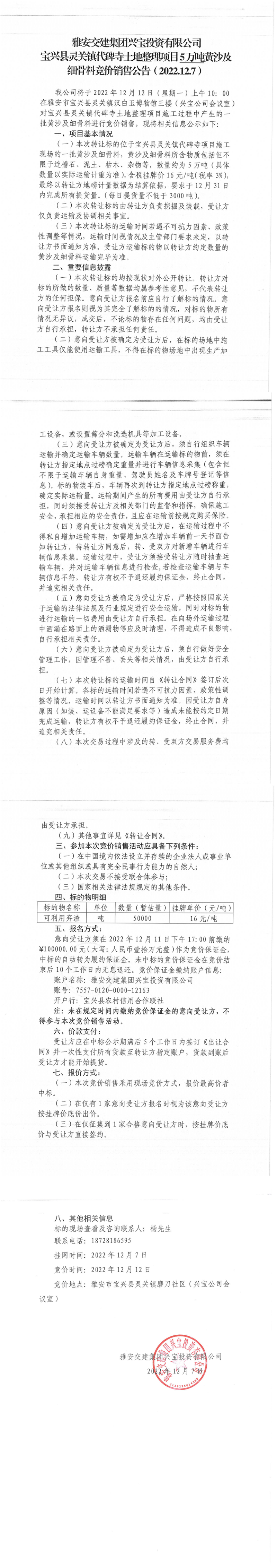 币游集团兴宝投资有限公司宝兴县灵关镇代碑寺土地整理项目一批黄沙及细骨料竞价销售挂网公告2022.12.7