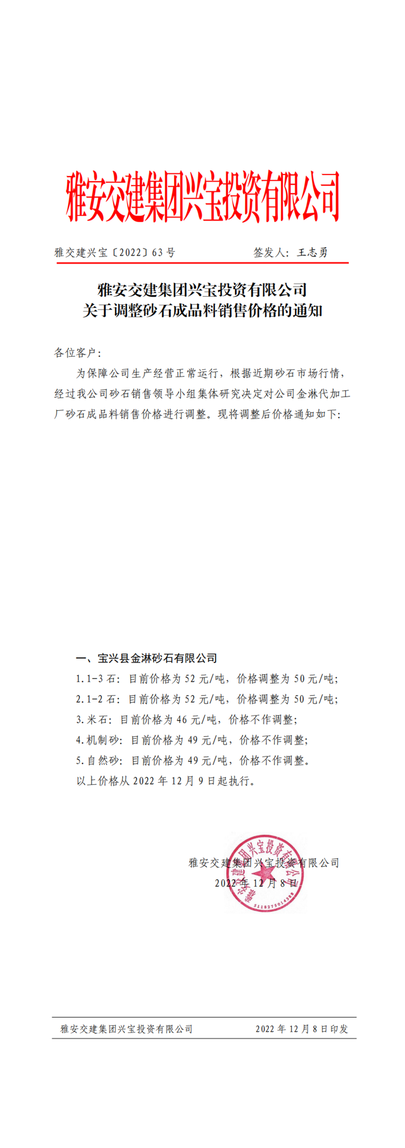 雅交建兴宝〔2022〕63号 关于调整砂石成品料销售价格的通知(2022-12-8)