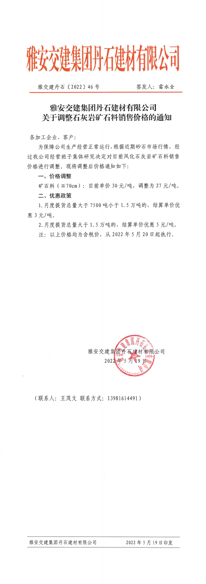 币游集团丹石公司关于调整石灰岩矿石料价格的通知-2022-5-19