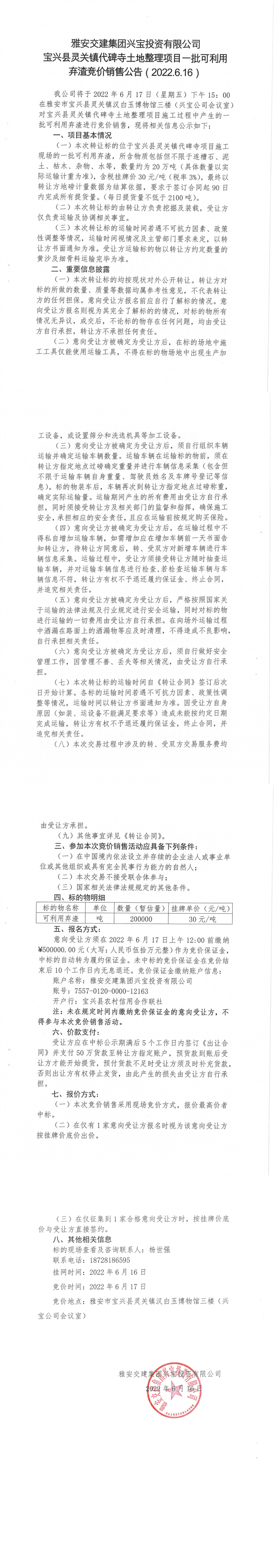 币游集团兴宝投资有限公司宝兴县灵关镇代碑寺土地整理项目-批可利用 弃渣第二次竞价销售公告( 2022.6.16 )