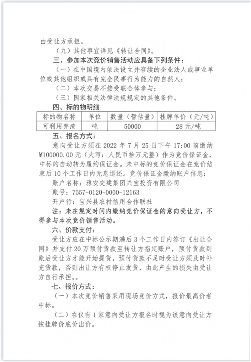 兴宝公司宝兴县灵关镇代碑寺土地整理项目10万吨可利用弃渣竞价销售挂网公告挂网公告7.22(5万吨)