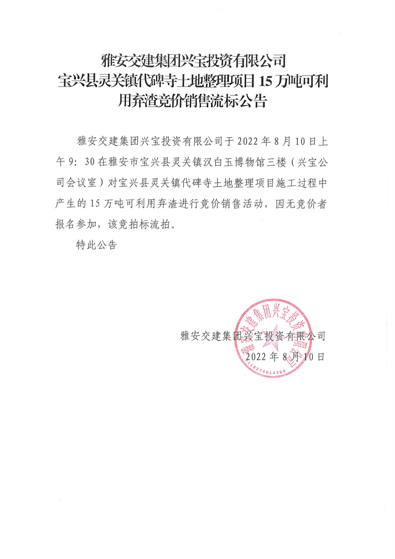 币游集团兴宝投资有限公司灵关镇代碑寺土地整理项目15万吨可利用弃渣竞价销售流标公告