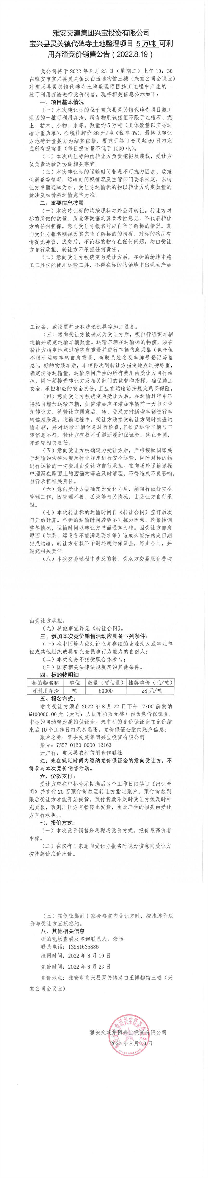 币游集团兴宝投资有限公司宝兴县灵关镇代碑寺土地整理项目10万吨可利用弃渣竞价销售成交公告(8.23)