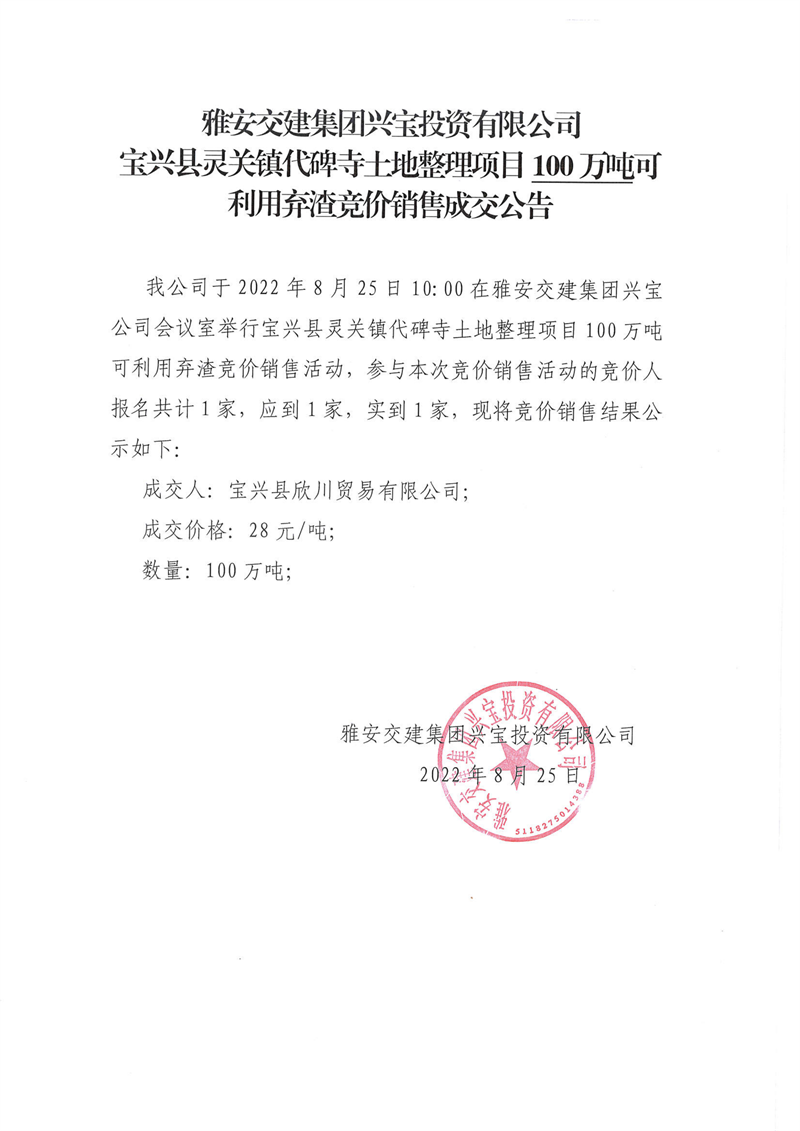 币游集团兴宝投资有限公司宝兴县灵关镇代碑寺土地整理项目5万吨可利用弃渣竞价销售成交公告(8.23)
