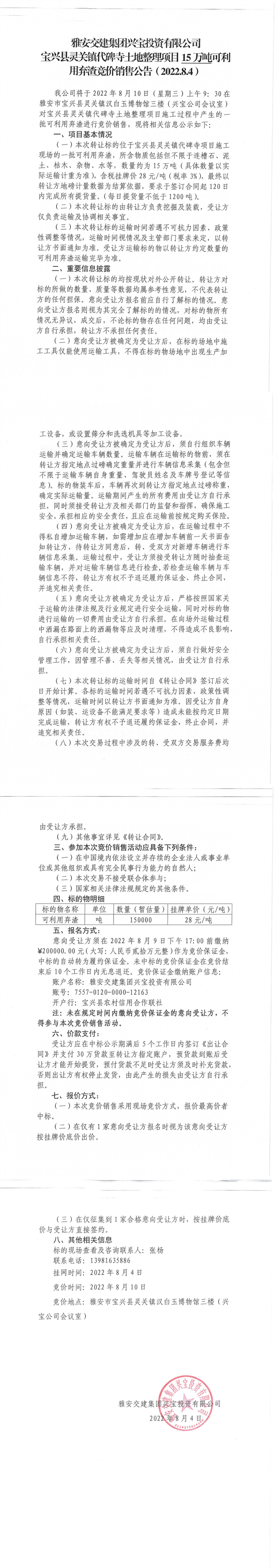 币游集团兴宝投资有限公司灵关镇代碑寺土地整理项目15万吨可利用弃渣竞价销售公告(2022.8.4)