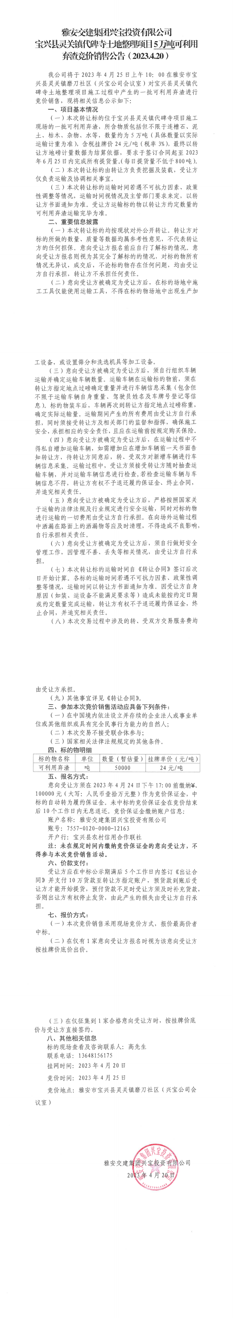 币游集团兴宝投资有限公司灵关镇代碑寺土地整理项目5万吨可利用弃渣竞价销售公告(2023.4.20)