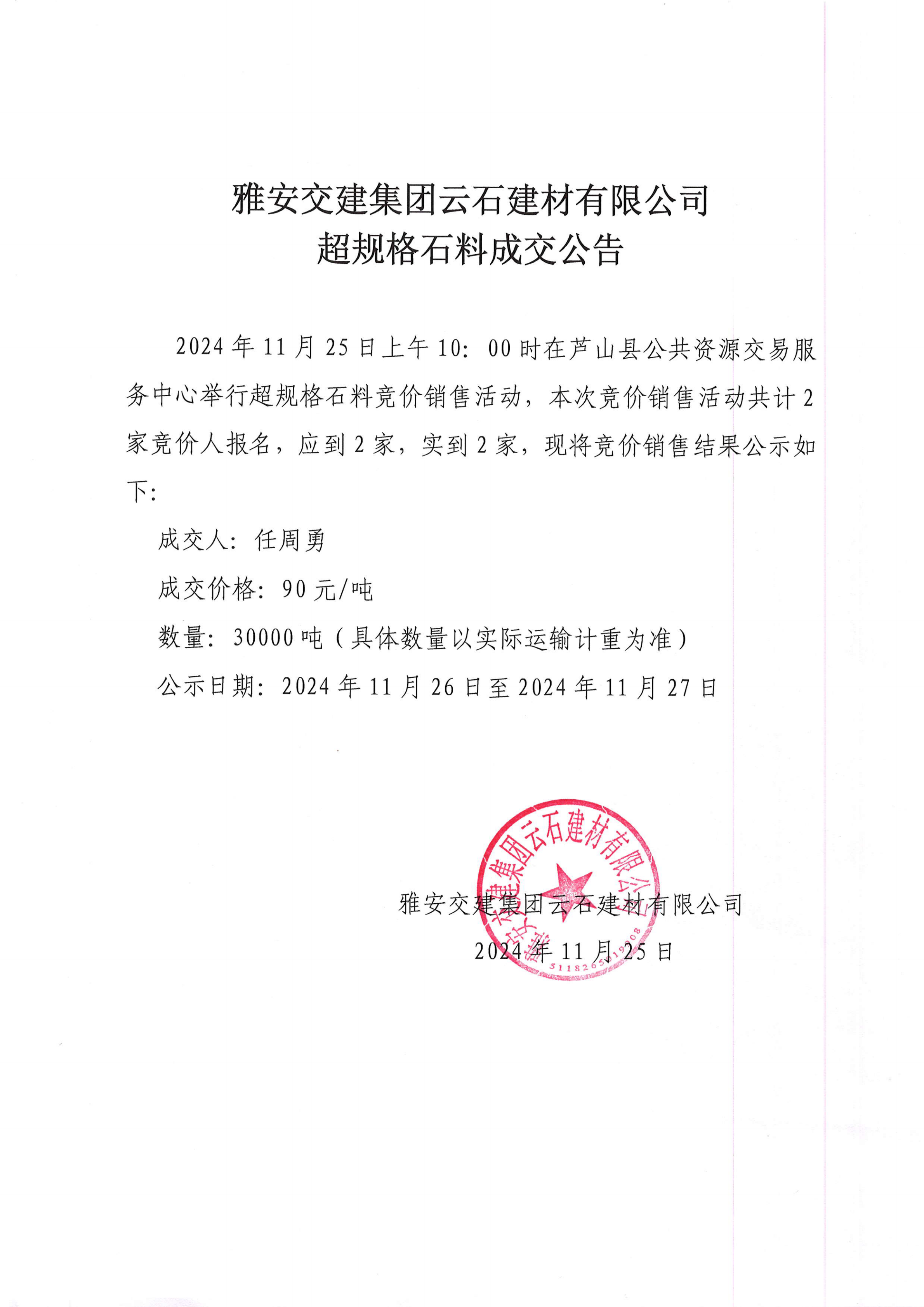 币游集团云石建材有限公司超规格石料竞价销售成交公告(2024-11-26)