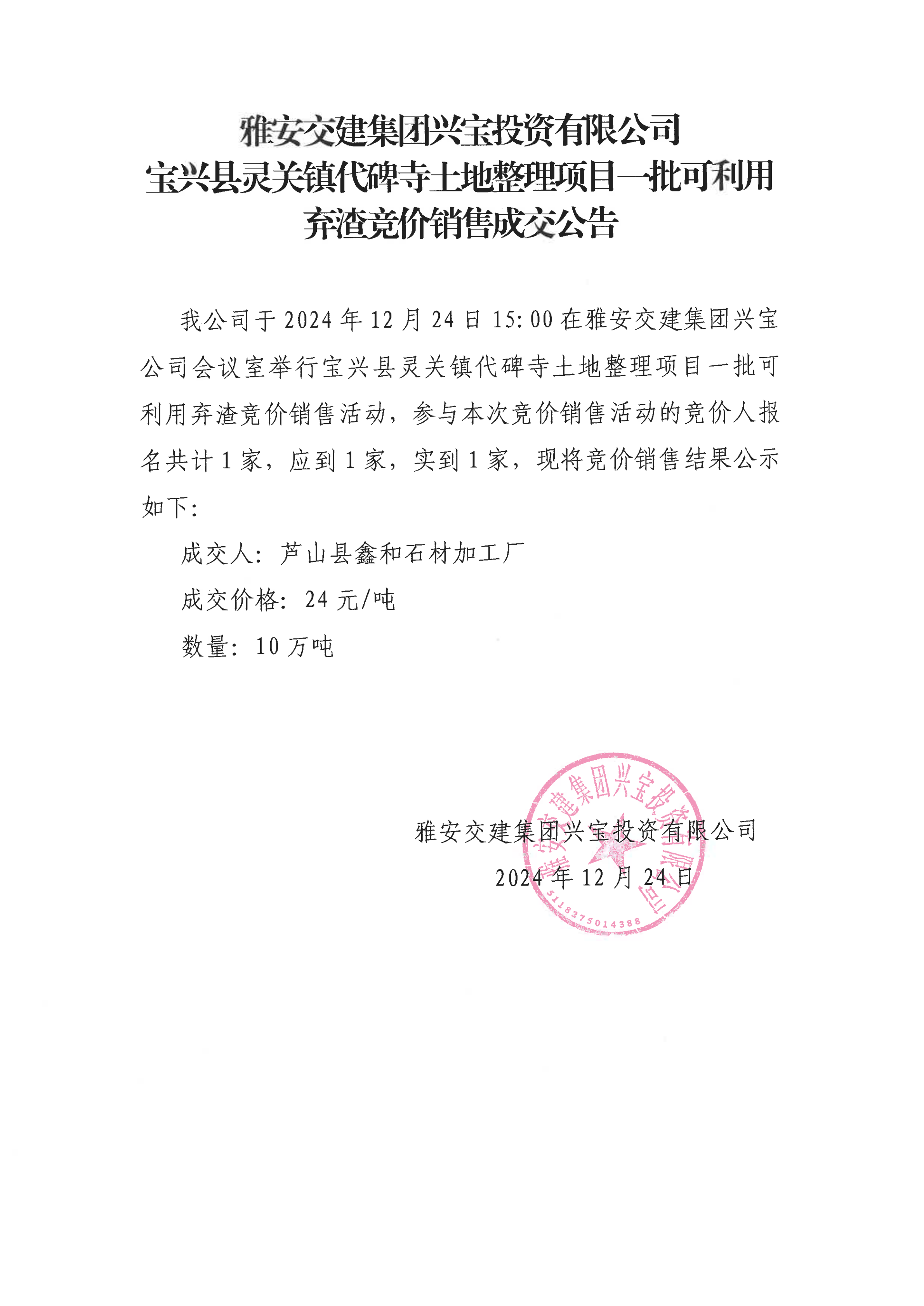 币游集团兴宝投资有限公司灵关镇代碑寺土地整理项目5万吨可利用弃渣成交公告(2024.12.24)
